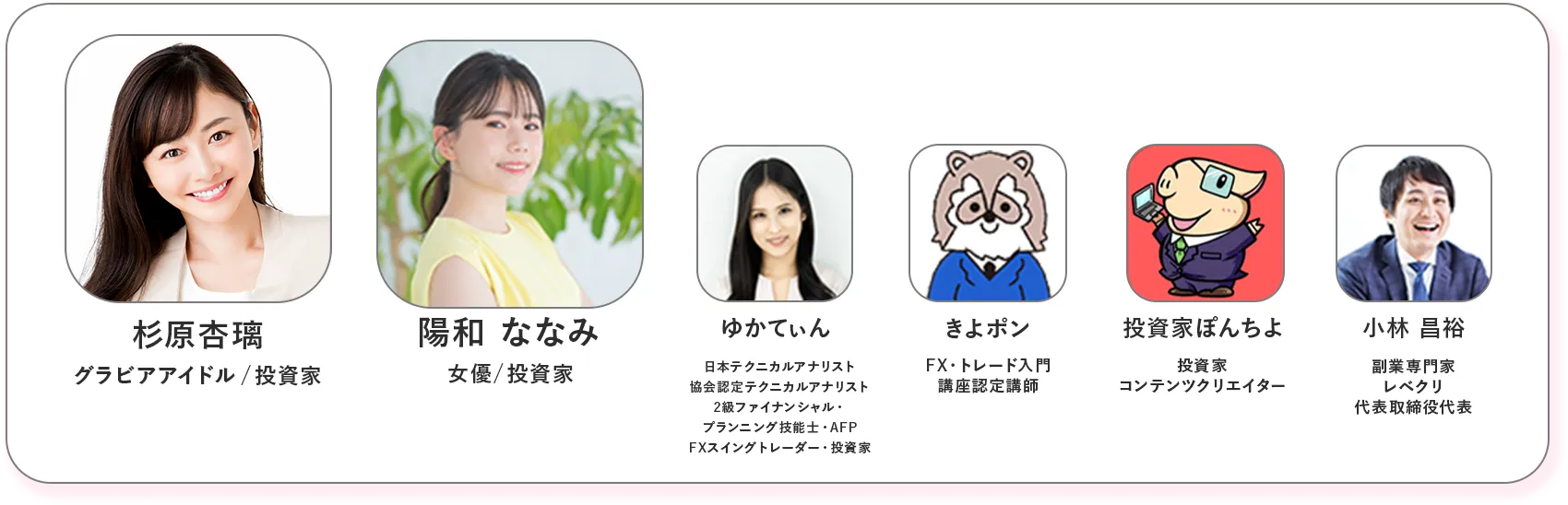 映画や舞台、CMに出演する傍ら、株や為替の取引を行うなど女優業と投資家の二刀流で活動中。自身のトレードでは、時間足のスイングトレードや日足での中長期投資を得意とし、ファイナンシャルプランナーの資格を活かし、投資や資金計画を含めたお金のプロフェッショナルを目指している。また、各企業のMC活動をこなしながら、最近では初心者向けの講義「ななみんの初心者向けプラクティス講座」を開催し、日本の投資家に向けて精力的に活動中。初心者にもわかりやすく、親しみやすい講義スタイルが好評。